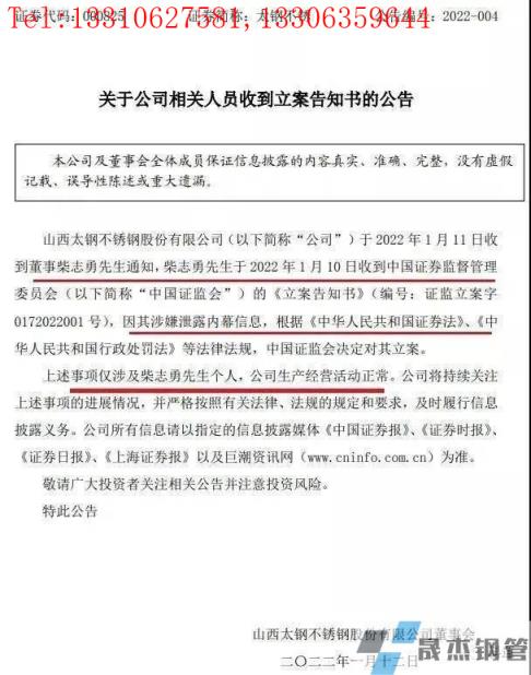 根據(jù)1月12日晚間,太鋼不銹發(fā)布的公告,公司董事柴志勇先生于2022年1月10日收到中國(guó)證券監(jiān)督管理委員會(huì)的《立案告知書(shū)》(編號(hào):證監(jiān)立案字0172022001號(hào)),因其涉嫌泄露內(nèi)幕信息,根據(jù)《中華人民共和國(guó)證券法》、《中華人民共和國(guó)行政處罰法》等法律法規(guī),中國(guó)證監(jiān)會(huì)決定對(duì)其立案。