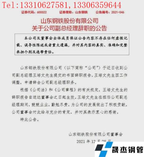 12月27日,山東鋼鐵發(fā)布公告,公司于近日收到公司副總經(jīng)理王培文提交的書面辭職報(bào)告,王培文因工作調(diào)整,申請(qǐng)辭去公司副總經(jīng)理職務(wù)。