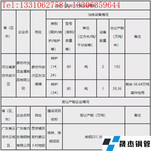 1月12日,河北工信廳發布變更廊坊市洸遠金屬制品有限公司部分產能出讓方案。方案表明,廊坊市洸遠金屬制品有限公司擬出讓80t轉爐3座給廣東南方東海鋼鐵有限公司,共計出讓煉鋼產能231.36萬噸,剩余56.64萬噸留作他用。