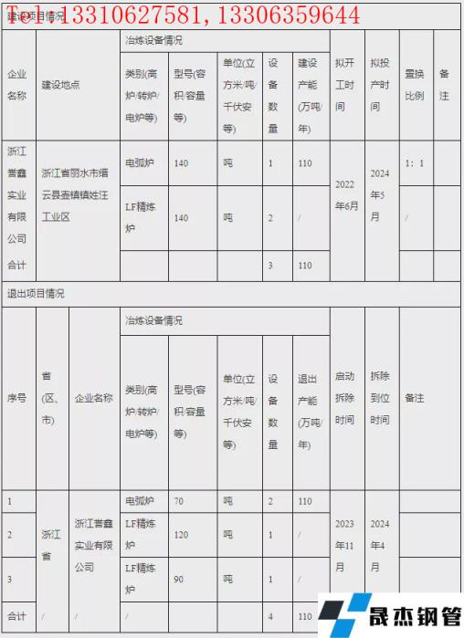 2022年1月7日,浙江省經信廳發布浙江譽鑫實業技術改造升級建設項目產能置換方案。方案顯示,浙江譽鑫實業有限公司擬于2022年6月新建140t電弧爐1座和140tLF精煉爐2座,產能110萬噸/年,項目預計2024年5月投產。同時退出70t電弧爐2座、120tLF精煉爐1座和90tLF精煉爐1座,共計退出產能110噸。項目于2023年11月啟動拆除,并于2024年4月拆除到位。