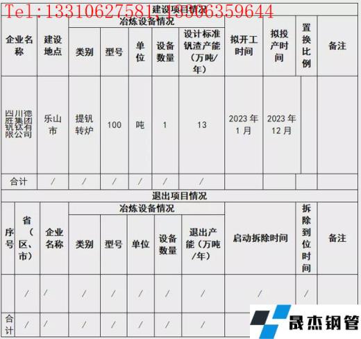 12月24日,四川省經信廳發布四川德勝集團釩鈦有限公司提釩轉爐建設項目產能置換方案。方案表明,四川德勝集團釩鈦有限公司擬于2023年1月在樂山市新建100t提釩轉爐1座,產能13萬噸/年,預計于2023年12月投產。