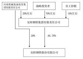 根據早前安鋼集團混改方案:先將安鋼集團100%股權評估后作價,出資至河南省國資委全資的河南機械裝備投資集團,同時將安陽鋼鐵20%股權無償劃轉到河南裝投集團;而后依托河南裝投集團在產權交易所公開掛牌并采取綜合評標方式確定一名戰略投資者,轉讓安鋼集團80%股權;戰略投資者對安鋼集團進行增資擴股,并實施員工持股等中長期激勵。