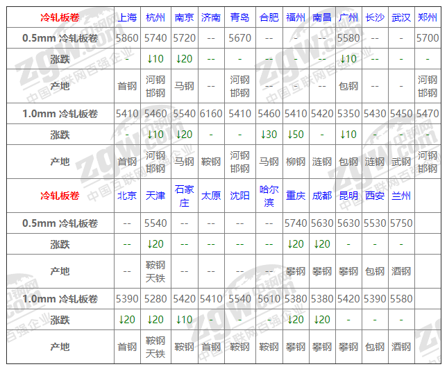 全國(guó)23個(gè)主要市場(chǎng)1.0mm 冷軋板卷平均價(jià)格5468元/噸,較上個(gè)交易日下調(diào)8元/噸。