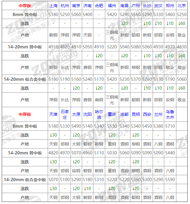 全國(guó)23個(gè)主要市場(chǎng)14-20mm 普中板平均價(jià)格5020元/噸,較上個(gè)交易日下調(diào)10元/噸。