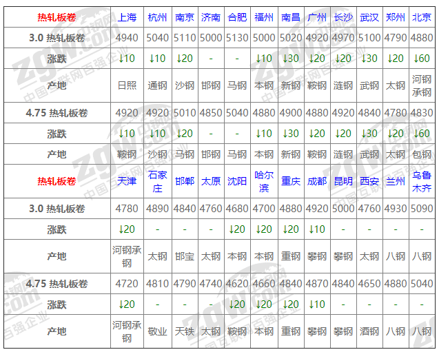 全國(guó)24個(gè)主要市場(chǎng)3.0 熱軋板卷平均價(jià)格4922元/噸,較上個(gè)交易日下調(diào)14元/噸。