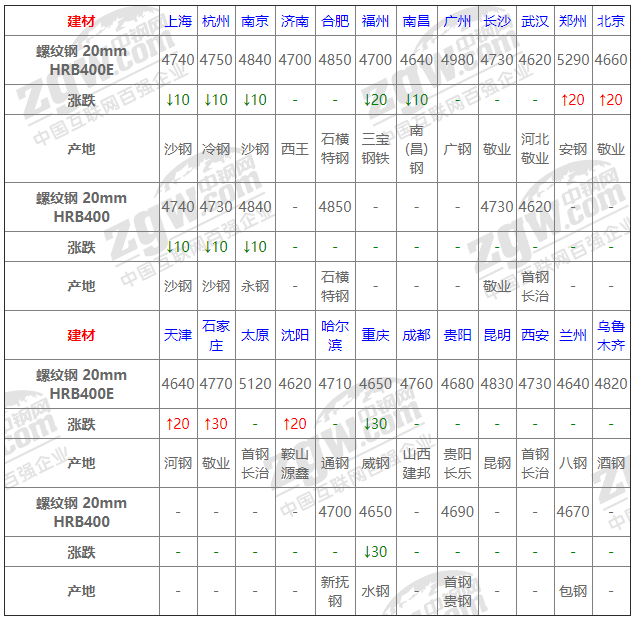 全國(guó)24個(gè)主要市場(chǎng)螺紋鋼 20mm HRB400E平均價(jià)格4770元/噸,較上個(gè)交易日上調(diào)2元/噸。