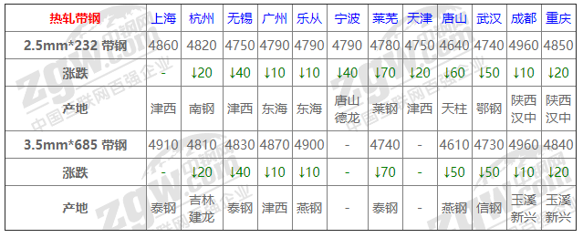 全國(guó)12個(gè)主要市場(chǎng)2.5mm*232 帶鋼平均價(jià)格4793元/噸,較上個(gè)交易日下調(diào)30元/噸。