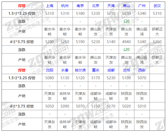 全國(guó)15個(gè)主要市場(chǎng)1.5寸*3.25 焊管平均價(jià)格5196元/噸,較上個(gè)交易日下調(diào)1元/噸。