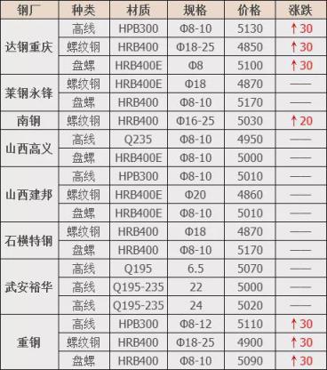 漲幅最高為達鋼重慶建材;