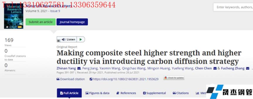 在本研究中,燕山大學提供了一種新的元素擴散策略,即輕元素(如碳)的長程擴散。與初始整體馬氏體鋼相比,該策略不會降低每一層的機械性能,并提高復合馬氏體鋼的強度和延展性。相關研究成果以題“Making composite steel higher strength and higher ductility via introducing carbon diffusion strategy”發表在國際著名期刊Materials Research Letters上。
