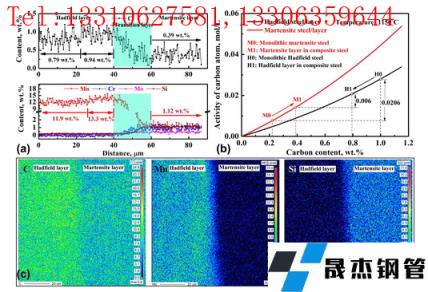 圖 2. EMPA 結果關于相鄰層(a 和 c)之間合金元素的含量以及使用 Thermal Calc 軟件(b)計算的碳活性。