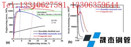 這種新工藝產生的機械性能及其與參考整體鋼的比較如圖3(a) 所示。不僅均勻延展性和總延展性分別提高了 190% 和 40%;與經過相同熱加工工藝處理的整體馬氏體鋼相比,屈服強度和極限抗拉強度顯著提高。復合鋼的應變硬化率較高,如圖3(b), 應負責增加的機械性能。這種復合鋼的強度和伸長率也高于在熱軋元素擴散后沒有最后 5 分鐘打孔工藝的鋼。該結果直接表明引入碳擴散策略可以同時提高高強復合鋼的強度和延展性。