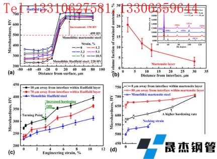 總之,盡管哈德菲爾德層為馬氏體貢獻了 20% 的碳,但仍保留了它的高應變硬化能力。這一點對于本研究中元素擴散策略的成功具有戰略意義。首先,哈德菲爾德層的初始硬化率與整體鋼相當。根據元素分布結果(圖 2(a)),兩層之間存在過渡層(約20μm厚),其厚度根據硬度分布增加到約45μm(圖 4)。該結果表明復合鋼由哈德菲爾德層、馬氏體層和梯度層組成。幾項關于梯度結構的有趣研究表明,在細晶粒和粗晶粒之間的界面處產生的應力不相容性可能導致應變梯度,這將通過梯度區域中的幾何必要位錯 (GND) 來適應 。