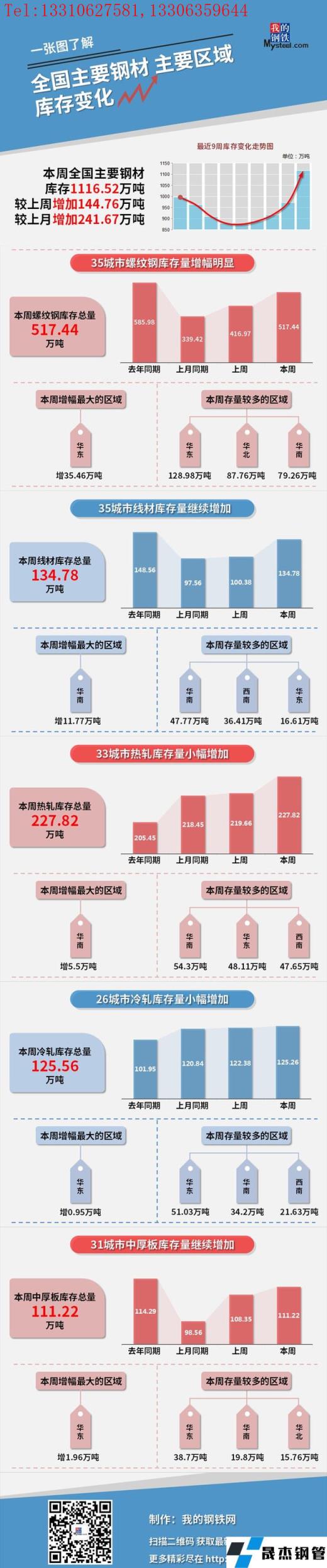 本周,全國(guó)主要鋼材社會(huì)庫(kù)存1116.52萬(wàn)噸,較上周增加144.76萬(wàn)噸,較上月增加241.67萬(wàn)噸;螺紋鋼庫(kù)存總量517.44萬(wàn)噸。