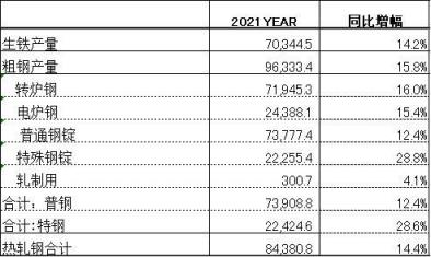 根據日本鋼鐵協會的統(tǒng)計,2021年日本生鐵產量為7034萬噸,同比增長14.2%。粗鋼產出當中,轉爐鋼產量為7194.5萬噸,同比提高16%,電爐鋼產量達2438.8萬噸,同比增長15.4%。