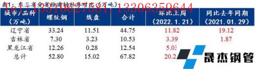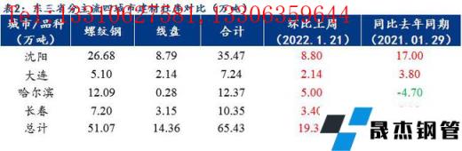 本周東三省建筑鋼材現貨庫存增加較多,增幅明顯超上周,其中螺紋鋼現貨庫存52.8萬噸,線盤15.02萬噸,建材社會庫存總量為67.82萬噸,較上周增20.24萬噸,增幅高達42.54%。隨著春節的臨近,北方下游終端工程進入全停工狀態,需求已無,出貨趨零,加之各個無縫鋼管廠家廠庫前移至市場各倉庫的現貨相對較多,社庫開始大幅度累庫。