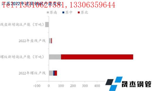 2022年江蘇產能整體呈現小幅增加的態勢,具體來看,蘇南地區螺紋產能新增100萬噸,淘汰30萬噸,蘇中區域暫無新增產能,蘇北區域產能增幅明顯,其中螺紋新增產能600萬噸;從生產條線來看,螺紋產線主要集中在蘇南、蘇北區域,蘇中區域占比較少,而盤線方面,主要是蘇南區域。整體2022年螺紋產線52條,同比新增5條,產能6504萬噸,同比新增700萬噸;盤螺產線25條,同比新增1條,淘汰1條,產能3520萬噸,淘汰30萬噸。