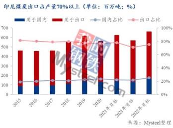從2015年-2021年印尼煤炭產(chǎn)量結(jié)構(gòu)可以看出,用于國內(nèi)的煤炭數(shù)量平均占總產(chǎn)量的25%左右,而外部出口要占產(chǎn)量的四分之三,這也與印尼DMO中要求的煤礦應(yīng)將25%煤炭輸送國內(nèi)電廠基本一致。