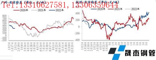 1月份廣州、杭州市場市場價格漲幅緩慢,北京市場價格漲幅居前,因此廣州-北京、杭州-北京市場的區域價差均有所收窄。目前廣州-北京價差在300元/噸左右,此價差略低于2020年、2021年同期水平,且結合無縫厚壁鋼管廠家的政策以及運費來看此價差也不足以吸引北方區域資源南下廣州。目前杭州-北京價差不足100元/噸,因北京價格相對高位,加之東北區域節后需求啟動較晚,因此東北區域部分無縫厚壁鋼管廠家傾向于把資源投放至北京區域,其中西林、新撫鋼甚至于海鑫都有此安排。