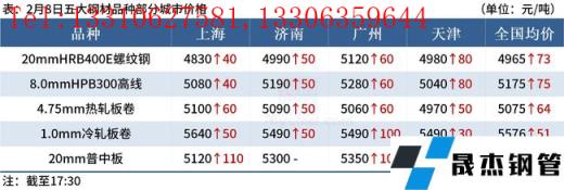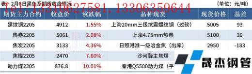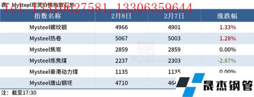 ◎ 2月8日下午,對山東、山西、河南三省43家無縫厚壁鋼管廠家限產狀態進行更新,涉及生鐵年產能1.58億。據調研了解,目前43家無縫厚壁鋼管廠家高爐產能利用率為75.31%,日均生鐵產量33萬噸。為保證冬奧會期間北京的空氣質量,預計未來三天內區域內將有11家無縫厚壁鋼管廠家的的燒結、高爐生產有所調整,調整期間影響日均鐵水產量4.56萬噸/日。