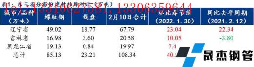 各主流城市分倉庫來看,春節(jié)后兩周以來沈陽市場幾大主流倉庫增庫較多;大連市場到貨節(jié)奏一般、正常累庫;吉林省內長春兩大主流倉庫現(xiàn)貨庫存也在增加。從無縫厚壁鋼管廠家產量及庫存來看,本周區(qū)域內樣本無縫厚壁鋼管廠家總產量47.7萬噸,較上周降1.20萬噸;廠庫總量14.19萬噸,與上周變化不大,僅增了0.08萬噸,社庫則大幅度增了40.52萬噸,目前區(qū)域內主導無縫厚壁鋼管廠家生產節(jié)奏與節(jié)前相比變化不大,不過下游終端仍未啟動,市場現(xiàn)貨消耗能力有限,社庫繼續(xù)大幅度累積,多數(shù)商戶表示正月十五后需求或有零星釋放,但真正有效的啟動時間要等到2月底3月初了,因此在無需求的情形下,預估下周東北區(qū)域社庫或仍將繼續(xù)增加。