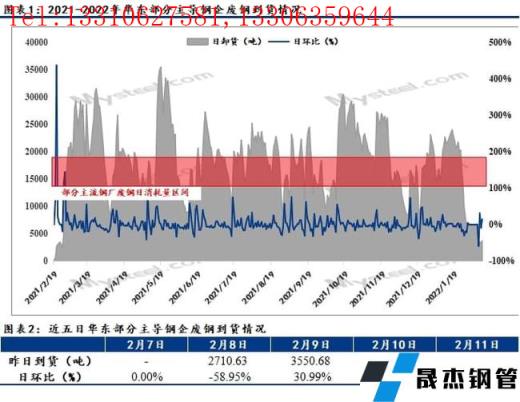 本省無縫厚壁鋼管廠家到貨情況基本處于往年同期低位水平,以本省主導鋼企為例,截止11日統計本省主導鋼企廢鋼到貨昨卸3710.52噸,較前一日增14.75%;今總計到船10條,海船3條,大小車20車。回顧開市以來的到貨情況,本省主導鋼企日均到貨遠低于日耗水平,完全處于耗庫狀態,且耗庫速度相對較快。因此,為滿足無縫厚壁鋼管廠家日耗所需,主導鋼企廢鋼采購價格拉漲或為大勢所趨。