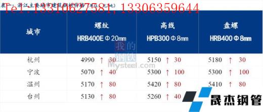從浙江省今日價格來看,省內價格有所上漲。其中杭州市場建筑厚壁無縫鋼管價格較昨日上漲30元/噸;寧波市場建筑厚壁無縫鋼管價格較昨日上漲40-100元/噸;溫州市場建筑厚壁無縫鋼管價格統(tǒng)漲80元/噸;臺州市場建筑厚壁無縫鋼管價格較昨日上漲40-110元/噸 。