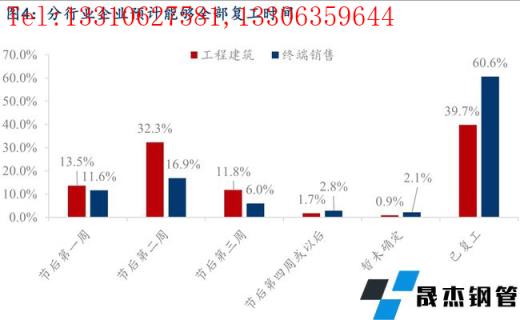 2、對于復工時間的調研發現:今年就地過年員工的比例雖然不及去年同期,但依然處于較高水平,工人返工較為便捷,因此節后企業預計能夠全部復工的時間也較去年大體相當,目前已全面復工樣本企業263家,占比達到51.3%,節后第二周內能夠復工的樣本企業占比高達87.5%。