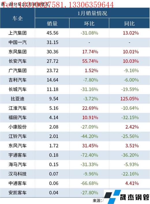 免責(zé)聲明:本網(wǎng)站(山東聊城晟杰無縫鋼管廠www.51pvc.cn)刊載的“1月我國汽車產(chǎn)銷降幅明顯,多數(shù)車企呈現(xiàn)雙位數(shù)下跌”等均源于網(wǎng)絡(luò),版權(quán)歸原作者所有,且僅代表原作者觀點(diǎn),本文所載信息僅供參考。轉(zhuǎn)載僅為學(xué)習(xí)與交流之目的,如無意中侵犯您的合法權(quán)益,請及時(shí)聯(lián)系刪除。本網(wǎng)站刊登此篇文章并不意味著本站贊同其觀點(diǎn)或證實(shí)其內(nèi)容的真實(shí)性,我們不對其科學(xué)性、嚴(yán)肅性等作任何形式的保證。如果侵犯了您的版權(quán),請盡快聯(lián)系我們予以撤銷,謝謝合作!
