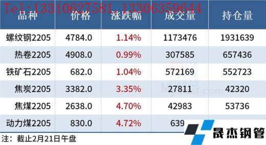 免責聲明:本網站(山東聊城晟杰無縫鋼管廠www.51pvc.cn)刊載的“2022年02月21日午報:鋼價多數上漲,黑色期貨集體飄紅”等均源于網絡,版權歸原作者所有,且僅代表原作者觀點,本文所載信息僅供參考。轉載僅為學習與交流之目的,如無意中侵犯您的合法權益,請及時聯系刪除。本網站刊登此篇文章并不意味著本站贊同其觀點或證實其內容的真實性,我們不對其科學性、嚴肅性等作任何形式的保證。如果侵犯了您的版權,請盡快聯系我們予以撤銷,謝謝合作!