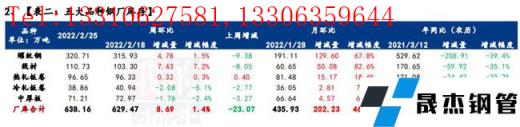免責聲明:本網站(山東聊城晟杰無縫鋼管廠www.51pvc.cn)刊載的“解讀:聚焦鋼鐵產業數據(2月24日)—板材總庫存首次去化,建材延續供庫雙增”等均源于網絡,版權歸原作者所有,且僅代表原作者觀點,本文所載信息僅供參考。轉載僅為學習與交流之目的,如無意中侵犯您的合法權益,請及時聯系刪除。本網站刊登此篇文章并不意味著本站贊同其觀點或證實其內容的真實性,我們不對其科學性、嚴肅性等作任何形式的保證。如果侵犯了您的版權,請盡快聯系我們予以撤銷,謝謝合作!