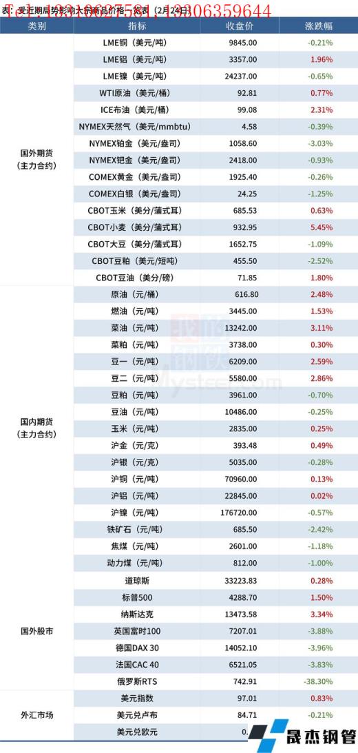 免責聲明:本網站(山東聊城晟杰無縫鋼管廠www.51pvc.cn)刊載的“受近期局勢影響大宗商品價格一覽表(2月24日)”等均源于網絡,版權歸原作者所有,且僅代表原作者觀點,本文所載信息僅供參考。轉載僅為學習與交流之目的,如無意中侵犯您的合法權益,請及時聯系刪除。本網站刊登此篇文章并不意味著本站贊同其觀點或證實其內容的真實性,我們不對其科學性、嚴肅性等作任何形式的保證。如果侵犯了您的版權,請盡快聯系我們予以撤銷,謝謝合作!
