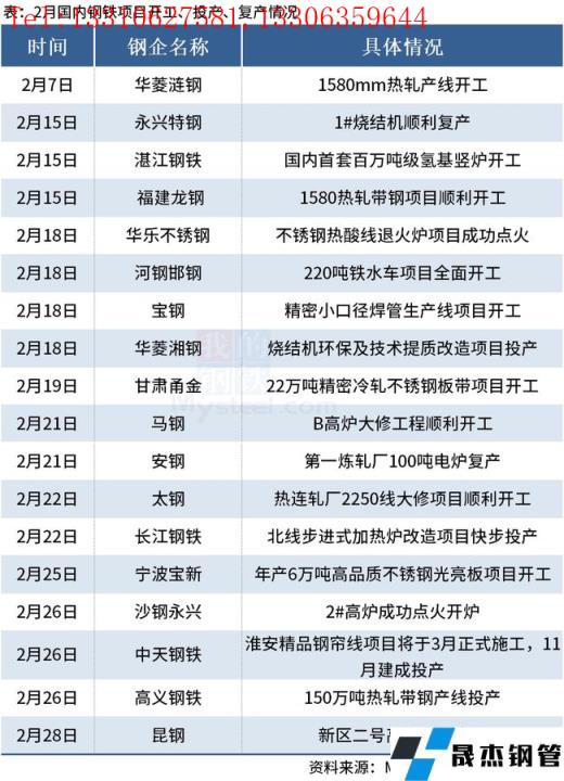 免責聲明:本網站(山東聊城晟杰無縫鋼管廠www.51pvc.cn)刊載的“2月國內18個鋼鐵項目開工、投產和復產”等均源于網絡,版權歸原作者所有,且僅代表原作者觀點,本文所載信息僅供參考。轉載僅為學習與交流之目的,如無意中侵犯您的合法權益,請及時聯系刪除。本網站刊登此篇文章并不意味著本站贊同其觀點或證實其內容的真實性,我們不對其科學性、嚴肅性等作任何形式的保證。如果侵犯了您的版權,請盡快聯系我們予以撤銷,謝謝合作!
