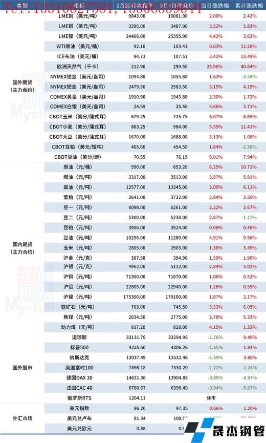 免責聲明:本網站(山東聊城晟杰無縫鋼管廠www.51pvc.cn)刊載的“受近期局勢影響大宗商品價格一覽表(3月1日)”等均源于網絡,版權歸原作者所有,且僅代表原作者觀點,本文所載信息僅供參考。轉載僅為學習與交流之目的,如無意中侵犯您的合法權益,請及時聯系刪除。本網站刊登此篇文章并不意味著本站贊同其觀點或證實其內容的真實性,我們不對其科學性、嚴肅性等作任何形式的保證。如果侵犯了您的版權,請盡快聯系我們予以撤銷,謝謝合作!