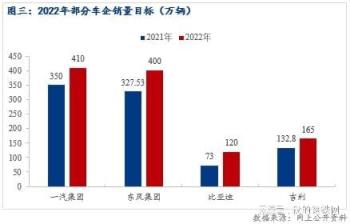 隨著2021年年底芯片緊張問題得到逐漸緩解。展望2022年汽車市場,如不再受到“缺芯”影響,汽車產能可以得到良好的釋放。從汽車銷售市場來看,在供給得到改善的情況下,今年的汽車銷量仍會保持較高增長,其中包含回補去年由于產量不足而導致的銷量缺失部分。我們在網上公開資料了解到,各大車企在制定今年的銷量目標時都是保持穩增長的態勢。在此做了簡單整理:
