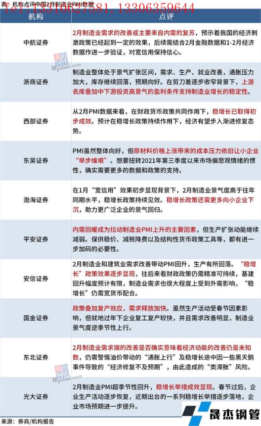 對于2月PMI超預(yù)期上行,機(jī)構(gòu)普遍認(rèn)為,2月制造業(yè)需求的改善或主要來自內(nèi)需的復(fù)蘇,預(yù)示著我國的經(jīng)濟(jì)刺激政策已經(jīng)起到一定的效果。在財(cái)政貨幣政策共同作用下,穩(wěn)增長已取得初步成效,結(jié)構(gòu)上呈現(xiàn)“需求、生產(chǎn)、就業(yè)改善,通脹壓力加大,庫存繼續(xù)回落,預(yù)期向好”特征。