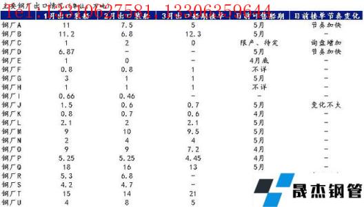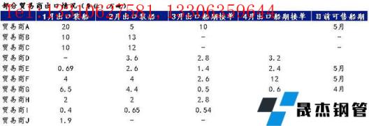 無縫厚壁鋼管廠家3:東北無縫厚壁鋼管廠家,主要以板材出口為主,也有少量線材出口。1月和2月板材出口量總共近20萬噸,其中板材出口超15萬噸。2月出口量較1月小幅減少。目前情況來看,3、4月平均接單情況也在5-6萬噸左右,并無出現(xiàn)明顯增長情況。