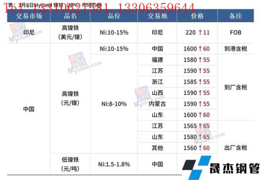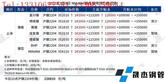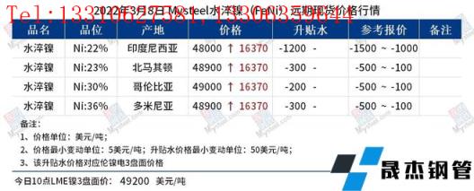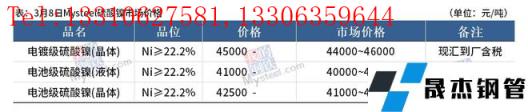 免責(zé)聲明:本網(wǎng)站(山東聊城晟杰無縫鋼管廠www.51pvc.cn)刊載的“鎳產(chǎn)業(yè)鏈價(jià)格(2022.3.8)”等均源于網(wǎng)絡(luò),版權(quán)歸原作者所有,且僅代表原作者觀點(diǎn),本文所載信息僅供參考。轉(zhuǎn)載僅為學(xué)習(xí)與交流之目的,如無意中侵犯您的合法權(quán)益,請及時(shí)聯(lián)系刪除。本網(wǎng)站刊登此篇文章并不意味著本站贊同其觀點(diǎn)或證實(shí)其內(nèi)容的真實(shí)性,我們不對其科學(xué)性、嚴(yán)肅性等作任何形式的保證。如果侵犯了您的版權(quán),請盡快聯(lián)系我們予以撤銷,謝謝合作!