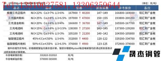 3月8日三元前驅(qū)體市場價(jià)格持平,523型14-14.5萬元/噸;622型14.8-15.2萬元/噸;811型15-15.6萬元/噸。