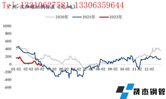 2月螺紋北京-沈陽月均價差+42元/噸,廣州-沈陽月均價差+33元/噸,上海-沈陽月均價差-89元/噸,濟(jì)南-沈陽月均價差+40元/噸。雖然本地尚未全面啟動,但本地?zé)o縫厚壁鋼管廠家跟漲節(jié)奏較快,帶動市場報價整體上漲,即東北價格繼續(xù)處在較高水平,南北無合適的價差已經(jīng)成為常態(tài)。