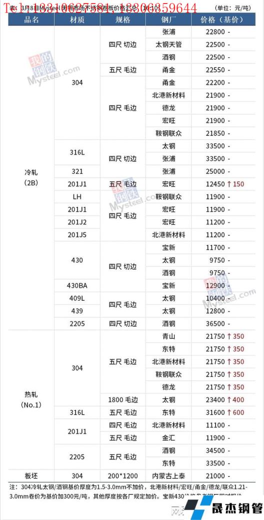 3月8日無錫市場300系價格偏強運行,日內民營冷熱軋價格漲幅1550-1600元/噸,截至下午四點,民營304冷軋主流價格至21900-22000元/噸毛基,民營熱軋資源五尺毛邊主流價格至21650-21950元/噸;200系價格偏強運行,日內冷熱軋有400元/噸左右的上漲,截至下午四點,無錫市場201J2/J5四尺冷軋價格主流成交在11200-11300元/噸毛基,五尺熱軋主流成交在11900-12000元/噸;400系價格穩中偏強運行,目前太鋼、酒鋼430冷軋切邊主流價格9750-9900元/噸。