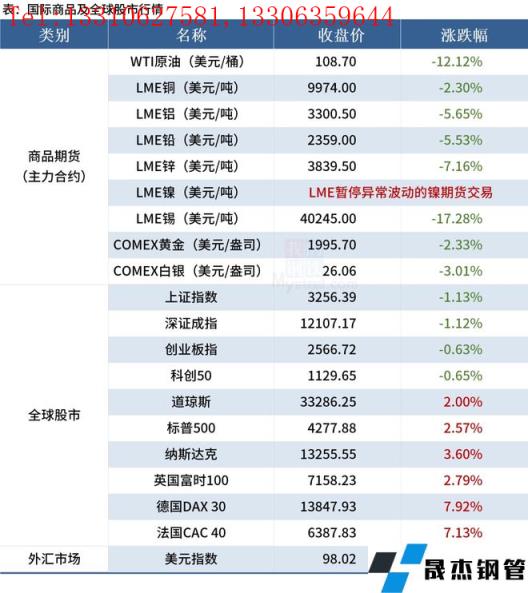 免責聲明:本網站(山東聊城晟杰無縫鋼管廠www.51pvc.cn)刊載的“2022年03月10日早讀:黑色系夜盤全線下挫,國際油價大跌超12%”等均源于網絡,版權歸原作者所有,且僅代表原作者觀點,本文所載信息僅供參考。轉載僅為學習與交流之目的,如無意中侵犯您的合法權益,請及時聯系刪除。本網站刊登此篇文章并不意味著本站贊同其觀點或證實其內容的真實性,我們不對其科學性、嚴肅性等作任何形式的保證。如果侵犯了您的版權,請盡快聯系我們予以撤銷,謝謝合作!