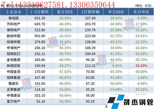 免責聲明:本網站(山東聊城晟杰無縫鋼管廠www.51pvc.cn)刊載的“15家重點房企2月銷售同比降幅擴大,房地產下行壓力持續”等均源于網絡,版權歸原作者所有,且僅代表原作者觀點,本文所載信息僅供參考。轉載僅為學習與交流之目的,如無意中侵犯您的合法權益,請及時聯系刪除。本網站刊登此篇文章并不意味著本站贊同其觀點或證實其內容的真實性,我們不對其科學性、嚴肅性等作任何形式的保證。如果侵犯了您的版權,請盡快聯系我們予以撤銷,謝謝合作!