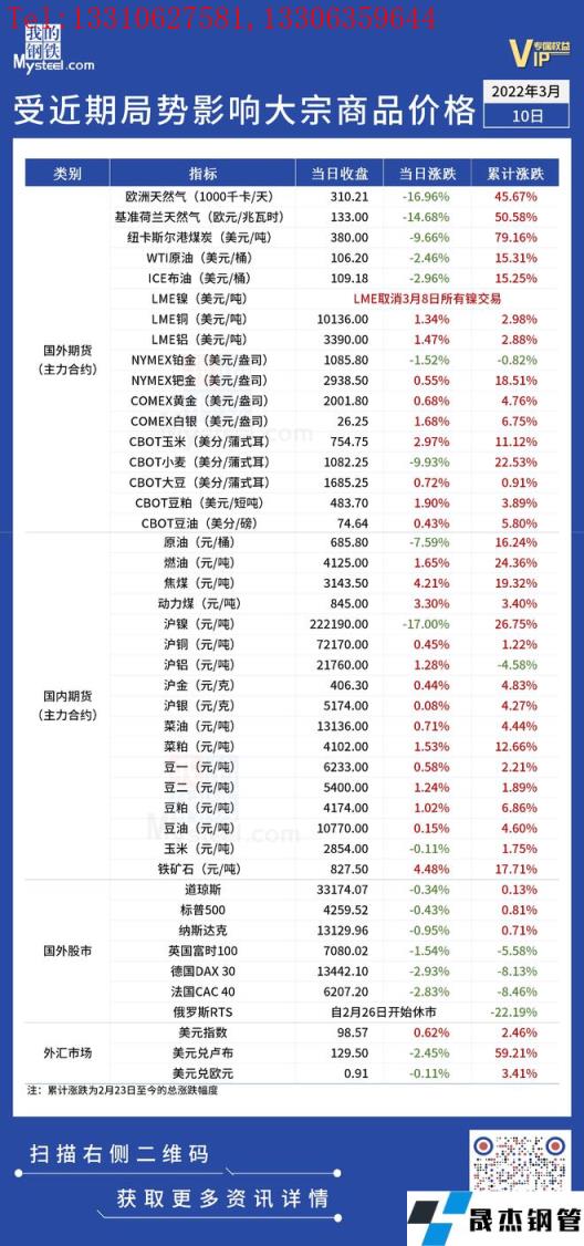近期,受國際局勢影響,全球金融及大宗商品市場出現較大波動。3月10日,國際能源價格繼續大幅回落,滬鎳主力合約恢復交易后跌停。匯總情況如下: