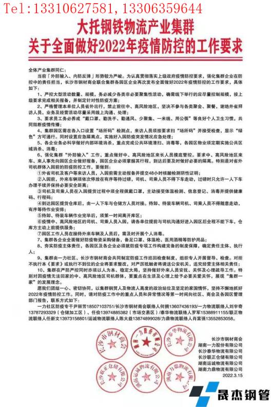 繼3月14日長(zhǎng)沙新增1例外省輸入新冠病毒核酸檢測(cè)初篩陽性后,相關(guān)部門已立即采取應(yīng)急處置措施。據(jù)小編了解,為認(rèn)真貫徹上級(jí)政府疫情防控要求,本地鋼鐵生產(chǎn)企業(yè)加強(qiáng)防控,層層核實(shí)人員情況,目前生產(chǎn)供應(yīng)情況一切正常。厚壁無縫鋼管市場(chǎng)交易活動(dòng)有序進(jìn)行,暫無工地受此影響停工。為防患于未然,長(zhǎng)沙市厚壁無縫鋼管商會(huì)聯(lián)合集群各園區(qū)企業(yè)再次發(fā)布全面做好2022年疫情防控的工作要求,具體情況如下: