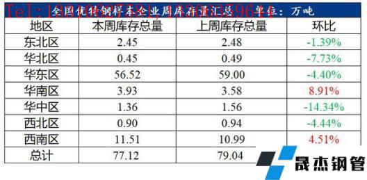 全國優特鋼棒材樣本總庫存77.12萬噸,環比下降1.92萬噸,降幅2.43%。