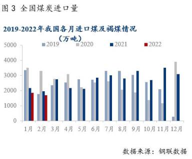 1-2月我國進口煤同環(huán)比大幅下降。2022年1-2月進口煤炭3539萬噸,同比下降14.0%,降幅比上年12月份收窄6.9個百分點。主要是受印尼1月煤炭禁止出口政策影響,影響1月下旬以及2月中上旬我國煤炭進口到港,疫情影響我國288口岸蒙煤通關量下降至100車左右,導致1-2月我國煤炭進口量同比大幅回落。2月下旬海外地緣沖突爆發(fā),短期對我國進口有一定影響,對2月影響體現(xiàn)不大。