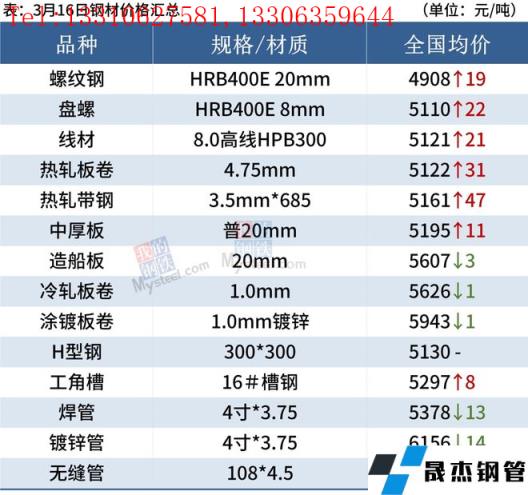 建筑厚壁無縫鋼管:3月16日,全國31個主要城市20mm三級抗震螺紋鋼均價4908元/噸,較上個交易日漲19元/噸。短期來看,在宏觀消息刺激下,市場悲觀情緒明顯修復,或將帶動現貨市場迎來反彈,至于反彈高度,仍需關注后期供需面變化,如北方地區近期高爐集中復產以及疫情對于需求端的影響。因此預期17日國內建筑厚壁無縫鋼管價格或將繼續趨強運行為主。