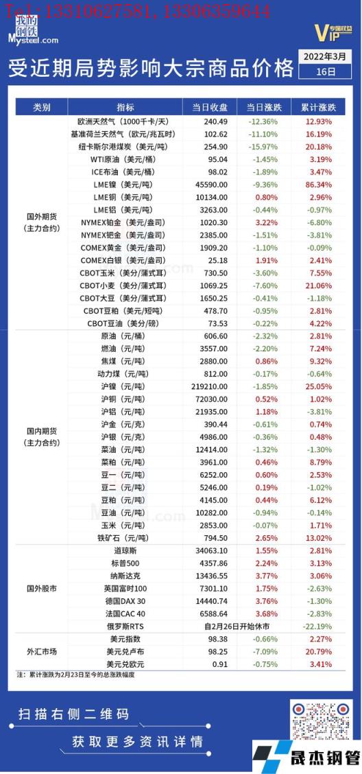 免責聲明:本網站(山東聊城晟杰無縫鋼管廠www.51pvc.cn)刊載的“受近期局勢影響大宗商品價格一覽表(3月16日)”等均源于網絡,版權歸原作者所有,且僅代表原作者觀點,本文所載信息僅供參考。轉載僅為學習與交流之目的,如無意中侵犯您的合法權益,請及時聯系刪除。本網站刊登此篇文章并不意味著本站贊同其觀點或證實其內容的真實性,我們不對其科學性、嚴肅性等作任何形式的保證。如果侵犯了您的版權,請盡快聯系我們予以撤銷,謝謝合作!