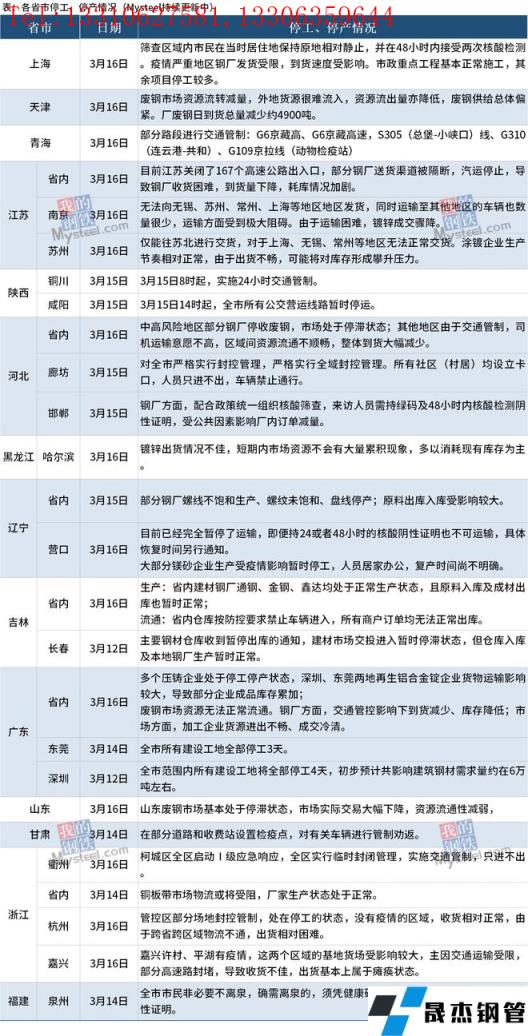 截至3月17日,匯總14個省份停工停產(chǎn)最新信息。其中,上海市疫情嚴重地區(qū)無縫厚壁鋼管廠家發(fā)貨受限,到貨速度受影響;市政重點工程基本正常施工,其余項目停工較多。河北省內(nèi)中高風險地區(qū)部分無縫厚壁鋼管廠家停收廢鋼 ,市場處于停滯狀態(tài);其他地區(qū)由于交通管制,司機運輸意愿不高,區(qū)域間資源流通不順暢,整體到貨大幅減少。廣東省內(nèi)多個壓鑄企業(yè)處于停工停產(chǎn)狀態(tài),深圳、東莞兩地再生鋁合金錠企業(yè)貨物運輸影響較大,導致部分企業(yè)成品庫存累加;吉林省省內(nèi)建材無縫厚壁鋼管廠家通鋼、金鋼、鑫達均處于正常生產(chǎn)狀態(tài),且原料入庫及成材出庫也暫時正常;省內(nèi)倉庫按防控要求禁止車輛進入,所有商戶訂單均無法正常出庫。具體情況如下: